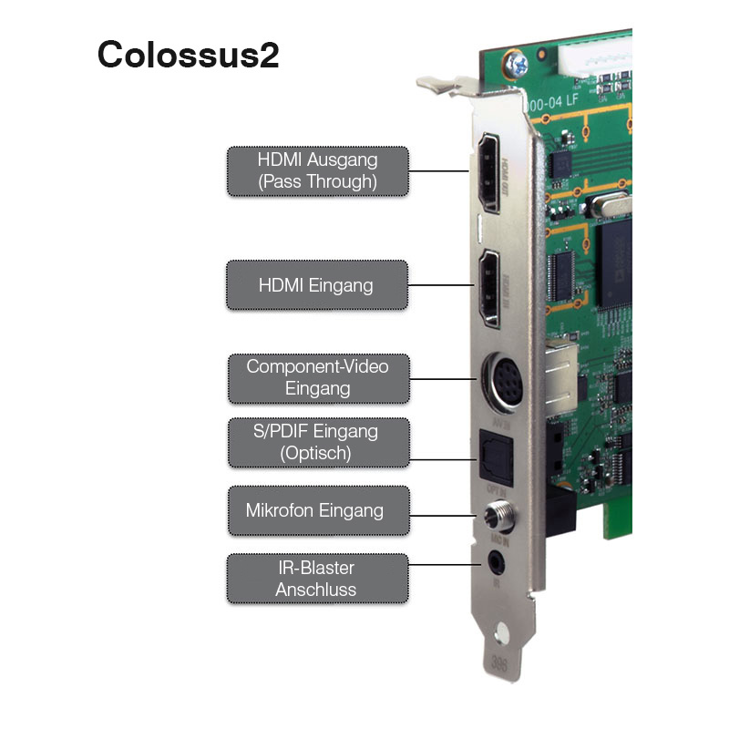 Colossus 2 ist ein High-Definition Videorekorder für den Einsatz in einem PCI Express x1 oder x16-Steckplatz. Ausgestattet mit einem High-End Video Encoder, ermöglicht Colossus 2 die Aufzeichnung von HD-Videosignalen von Component-Video und HDMI in einer Auflösung bis zu 1080p30, sowie die Unterstützung von 1080p60-Passthrough.